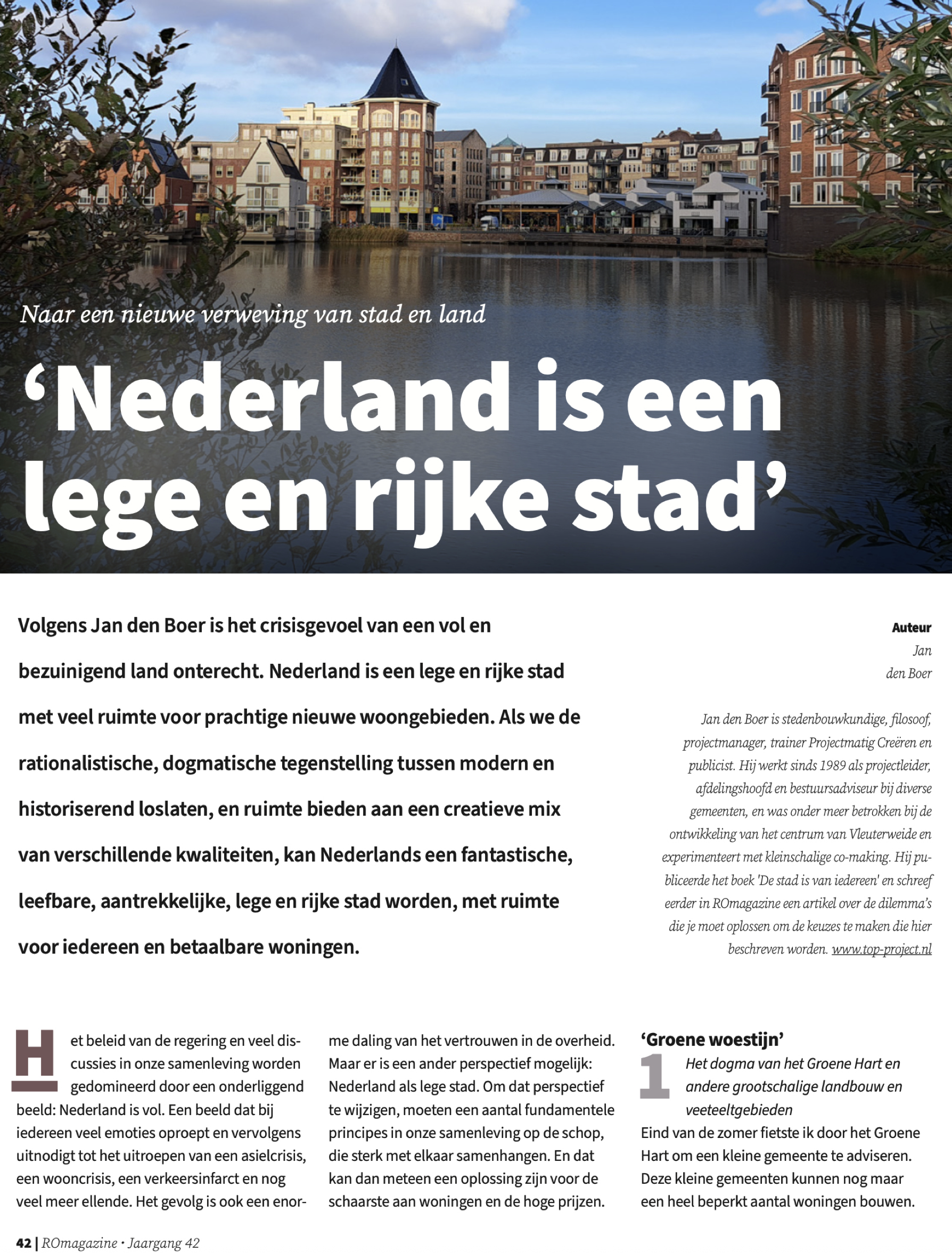 Volgens Jan den Boer is het crisisgevoel van een vol en bezuinigend land onterecht. Nederland is een lege en rijke stad met veel ruimte voor prachtige woongebieden. Als we de rationalistische, dogmatische tegenstelling tussen modern en historiserend loslaten en ruimte bieden aan een creatieve mix van verschillende kwaliteiten, kan Nederland een fantastische, leefbare, aantrekkelijke, lege en rijke stad worden, met ruimte voor iedereen en betaalbare woningen.