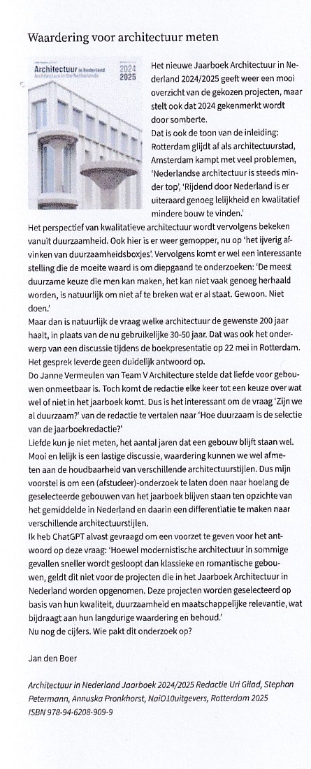 Het gaat ook over duurzaamheid. En dan is een belangrijke vraag: wat is duurzame architectuur die zijn waarde behoudt en dus behouden blijft, en welke architectuur leidt weer snel tot sloop en nieuwbouw? Deze duurzaamheidsvraag in de kwaliteitsdiscussie over architectuur is nieuw.
